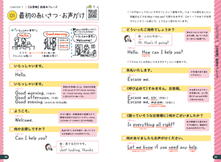冒頭の章では、全業種共通で活用することができる便利なフレーズを厳選!「最初の挨拶」、「ご案内」、「お見送り」など、どの業種でも使用する汎用性の高いフレーズばかりなので、ここを押さえるだけでも安心です。さらに、続く各章では【飲食業、販売業、宿泊・レジャー、交通】など、業種別に必要なフレーズを掲載しています。それぞれの業種でしか使わない独特な表現まで網羅しているので、探し求めていた“本当に使える英語表現”を見つけることができます。[画像2: https://prcdn.freetls.fastly.net/release_image/2535/8632/2535-8632-32074a5f503a03e121aa5b5498793f47-441x324.png?width=536&quality=85%2C75&format=jpeg&auto=webp&fit=bounds&bg-color=fff ]