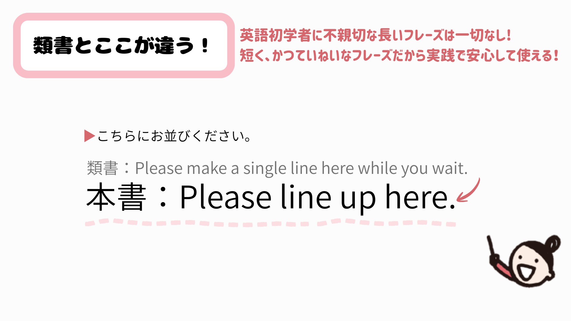 日本に訪れる外国人の多くは、アジア圏から来日している「英語を母語としない方々」。本書では、そうした英語ネイティブではない相手にも、英語学習初心者の方にも伝わりやすい、やさしい表現にこだわりました。使用している単語の難易度は低めにおさえ、フレーズの長さも短いため、忙しい接客現場でも即実践できるのが本書の最大の魅力です。[画像3: https://prcdn.freetls.fastly.net/release_image/2535/8632/2535-8632-f757618141048df21eadadc999bc4c4d-1920x1080.png?width=536&quality=85%2C75&format=jpeg&auto=webp&fit=bounds&bg-color=fff ]