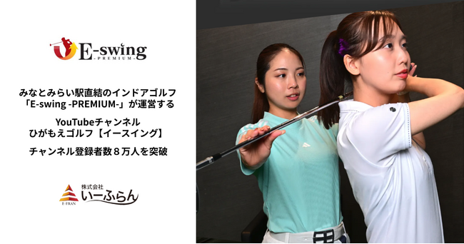株式会社いーふらん(本社:神奈川県横浜市、代表取締役社長:鹿村大志)は、同社が展開するインドアゴルフスクール「E-swing -PREMIUM-」において、「E-swing -PREMIUM-」が運営するYouTubeチャンネル、「ひがもえゴルフ【イースイング】」のチャンネル登録者数が8万人を突破したことをお知らせいたします。