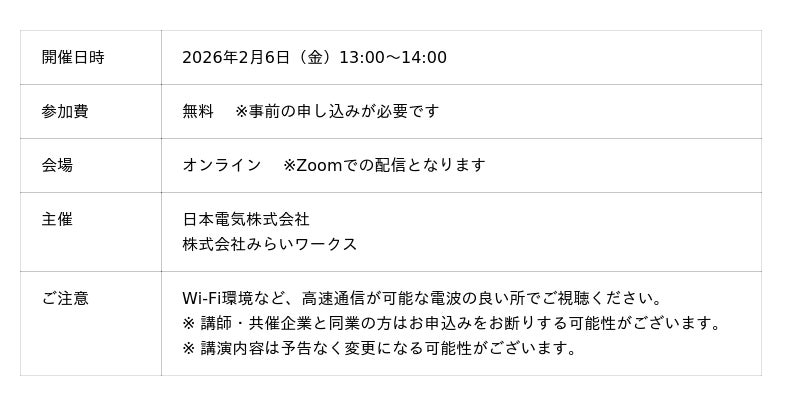 即戦力となるプロフェッショナル人材のマッチングサービス『フリーコンサルタント.jp』を展開する株式会社みらいワークス(本社:東京都港区、代表取締役社長 岡本 祥治、以下「当社」)は、2026年2月6日(金)、日本電気株式会社と共催でオンラインセミナーを開催します。