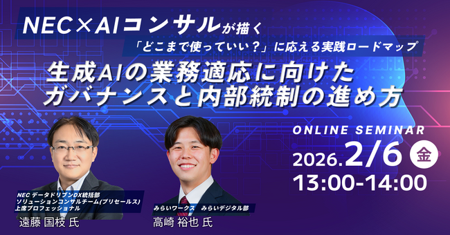【2月6日(金) オンライン開催】生成AIの業務適応に向けたガバナンスと内部統制の進め方~NEC×AIコンサルが描く、「どこまで使っていい?」に応える実践ロードマップ~|無料セミナー