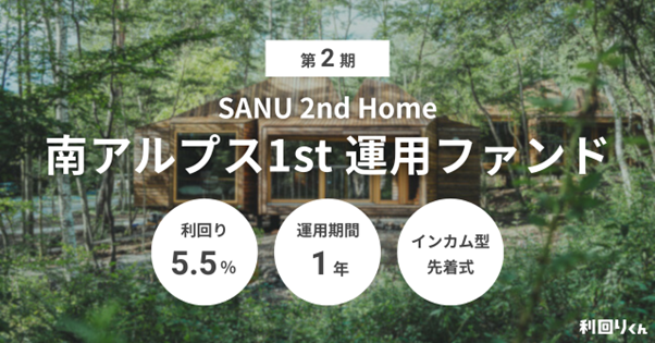 [画像4: https://prcdn.freetls.fastly.net/release_image/143674/84/143674-84-ddded05282171644add71bebd7177b6b-602x372.png?width=536&quality=85%2C75&format=jpeg&auto=webp&fit=bounds&bg-color=fff ]ファンド名:第2期 SANU 2nd Home 南アルプス1st 運用ファンド