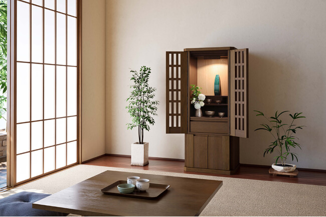 【株式会社 現代仏壇】格子扉からこぼれる光が空間をやさしく包み込む。現代の住まいに合う和モダンなお仏壇「月ヶ瀬remade」を新発売