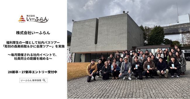 株式会社いーふらん(本社:神奈川県横浜市)は、福利厚生の一環として実施している社内バスツアーにおいて、「会長と行く箱根 彫刻の森美術館&かに会席バスツアー」を開催しました。本取り組みは、社員同士の交流を深めることを目的に毎月実施しているもので、今回で56回目の開催となります。