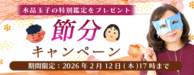 『節分キャンペーン』では、旧暦での大晦日、そして1年の運気の変わり目を迎える「節分」に合わせて、2026年の明らかにする鑑定をご用意したキャンペーンとなっております。キャンペーン期間中、対象鑑定を占うと、今しか占えない水晶玉子の特別鑑定をプレゼント!
