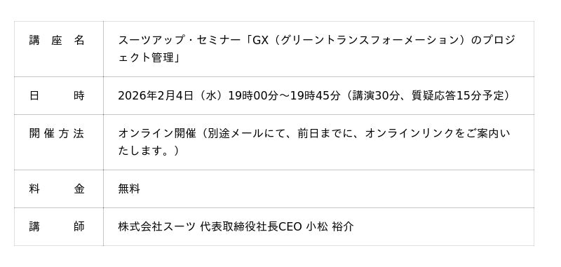 当社では、2026年2月4日(水)19時から、当社代表の小松が講師を務めるスーツアップ・セミナー「GX(グリーントランスフォーメーション)のプロジェクト管理」を無料開催します。