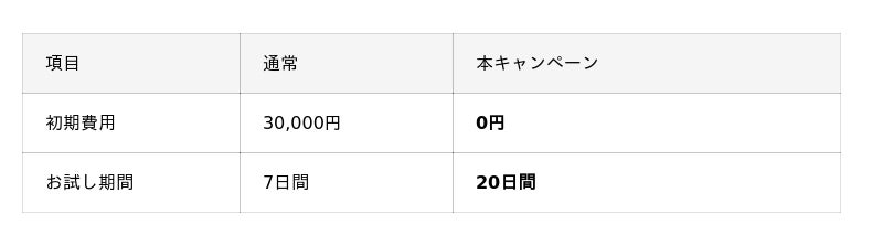 本キャンペーンでは、通常30,000円の初期費用が無料になるほか、トライアル期間を通常の7日間から20日間へ大幅に延長。