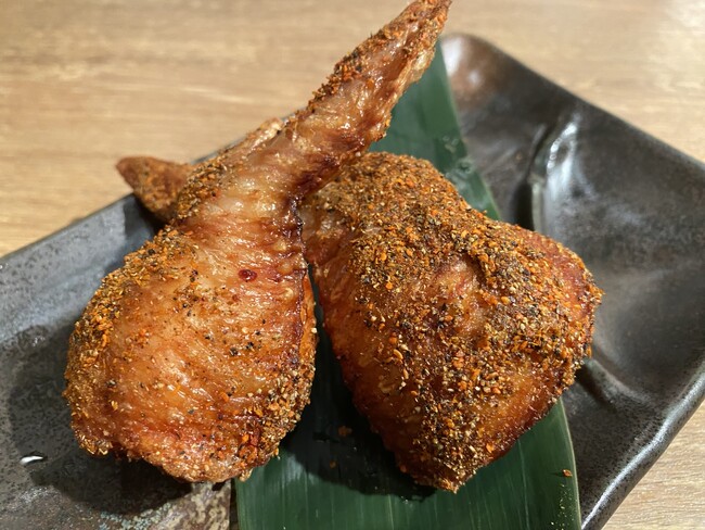 「麻辣手羽餃子(2本入り)」は、一味をふんだんに使った、花椒の香りが癖になる一品です。