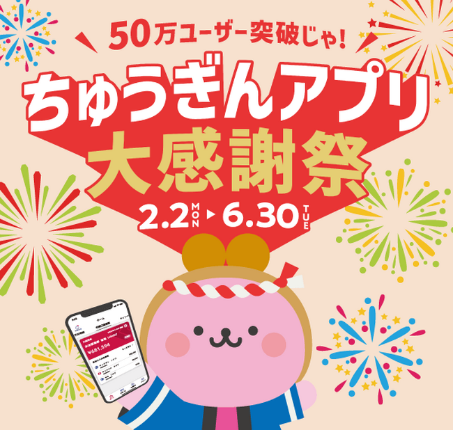 中国銀行(岡山市 頭取 加藤 貞則)は、「ちゅうぎんアプリ」のユーザー数が50万人を突破したことを記念し、2026年2月2日(月)~2026年6月30日(火)の期間限定で、「50万ユーザー突破じゃ!ちゅうぎんアプリ大感謝祭」を開催いたします。