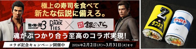 『龍が如く 極3 / 龍が如く3外伝 Dark Ties』×「銀のさら」2026年2月2日(月)より各種コラボキャンペーンを展開ゲーム内のアイテムを模したオリジナル太巻も期間限定で登場!