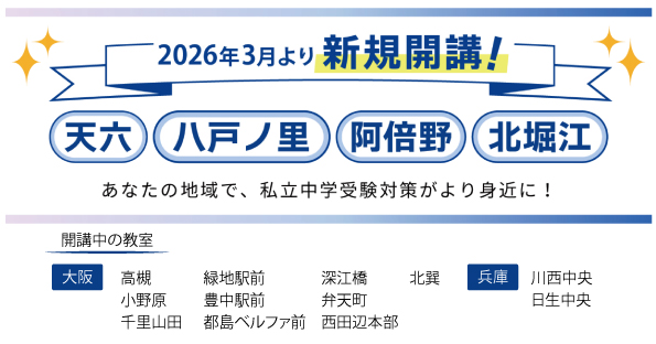 開成教育セミナーが展開する中学受験専門コース「開成ベガ」は、生徒一人ひとりの大幅な成績アップと第一志望校合格を最優先に掲げ、日々指導を行っております。このたび、2026年3月に、大阪府内の4教室にて新たに開成ベガを開講する運びとなりました。