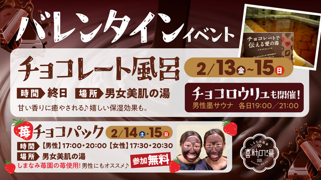 内容:「しまなみいちご園」のフレッシュな苺を使用した贅沢なチョコパックを、男女の美肌の湯にて無料で体験いただけます。男性のお客様にもおすすめの美肌体験です。さらに、男性サウナ室では各日19:00と21:00に「チョコロウリュ」も開催し、施設全体がバレンタイン一色に染まります。