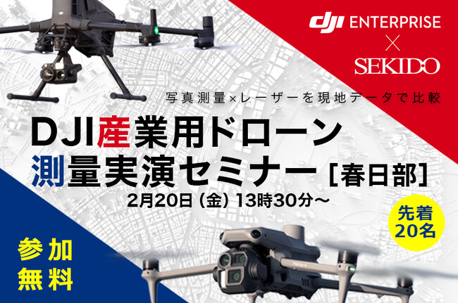 DJI(ディージェイアイ)正規販売代理店としてドローンビジネスの最前線を支える株式会社セキド(本社:東京都港区、代表取締役:大下貴之)は、2026年2月20日(金)13時30分より埼玉県春日部市にて、測量業務に特化した無料実演会「DJI産業用ドローン 測量実演セミナー in 春日部(午後の部)」を開催いたします。