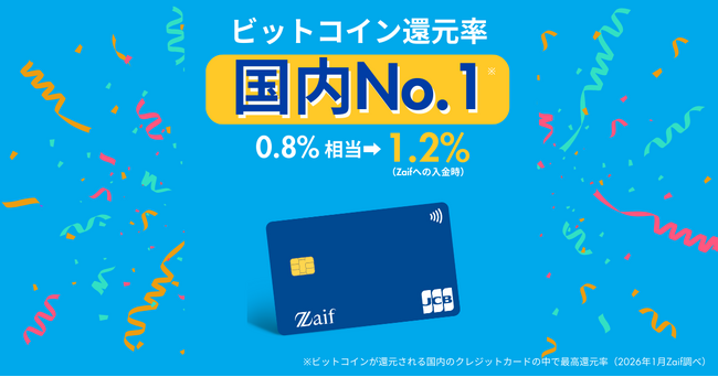 株式会社Zaifは、ビットコインが還元されるクレジットカード「Zaifカード」の還元率が、2026年2月1日(日)より暗号資産取引所Zaifでの利用に限り、従来の0.8%から1.2%相当に引き上げされたことをお知らせいたします。