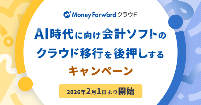 株式会社マネーフォワードは、会計ソフトのクラウド移行を支援するキャンペーン※1を2026年2月1日(日)より開始しました。本キャンペーンでは、クラウド会計ソフトの導入・移行時のコスト負担を大幅に軽減し、スムーズなクラウド移行を後押しすることで、加速するAI時代に向けて、中小から中堅まで幅広い企業が強固なバックオフィス基盤を構築できるよう支援します。