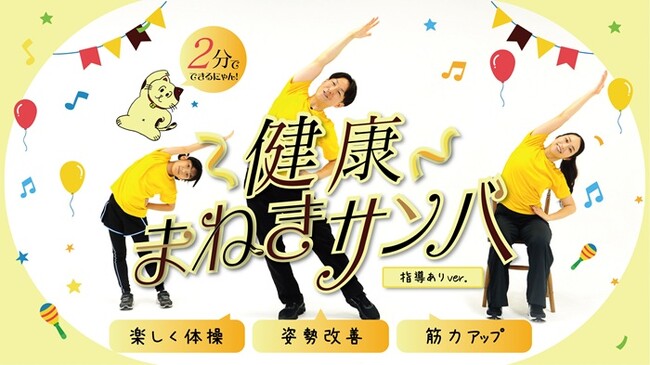 「健康まねきサンバ」は、従来の「健康まねき体操」をベースに、子どもから元気な高齢者まで、幅広い世代の皆さまに楽しみながら取り組めるよう、サンバのリズムに合わせて体を動かす体操です。