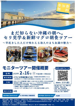 東武トップツアーズ株式会社(本社:東京都墨田区、代表取締役社長:百木田康二)は、沖縄県より「イマイユ市場見学ツアー実証試験事業委託業務」を受託し、糸満漁港(北地区)の高度衛生管理型荷捌施設(愛称:イマイユ市場)を活用したモニターツアーを実施しますのでお知らせいたします。