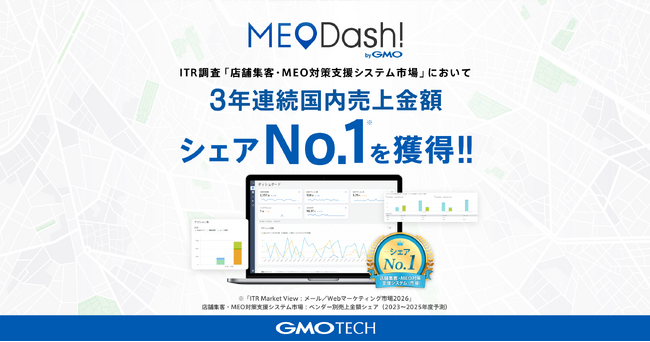 GMOインターネットグループのGMO TECH株式会社(代表取締役社長:鈴木 亮一 以下、GMO TECH)が提供するMEO(※1)店舗DX管理サービス「MEO Dash! byGMO」が、「ITR Market View:メール/Webマーケティング市場2026」(株式会社アイ・ティ・アール/2026年1月15日発行)に掲載された「店舗集客・MEO対策支援システム市場」におけるベンダー別売上金額シェアにおいて、2023・2024年度の実績および2025年度の予測で、3年連続国内売上金額シェアNo.1を獲得しました。