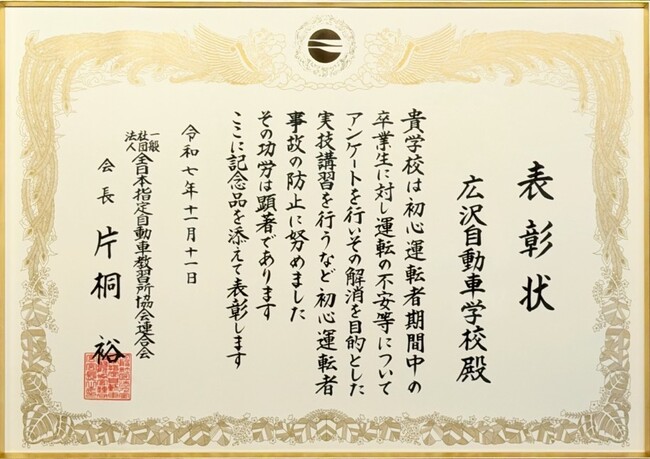初心運転者の事故防止に向けた教育が評価、広沢自動車学校が交通安全教育の取り組みで表彰