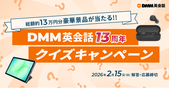合同会社DMM.com(本社:東京都港区、PFカンパニーCEO:村中悠介、以下DMM)が運営する「DMM英会話」( https://eikaiwa.dmm.com/ )は、2026年2月でサービス開始から13周年を迎えるにあたり、「13周年ありがとうキャンペーン」を実施いたします。また同時に、従来3日間ご利用いただけた無料体験レッスン期間を7日間へ拡大したことをお知らせいたします。