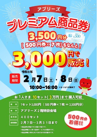 弘前駅ビル アプリーズでは、2026年2月7日(土)・8日(日)の2日間限定で、お得なプレミアム商品券を販売します!