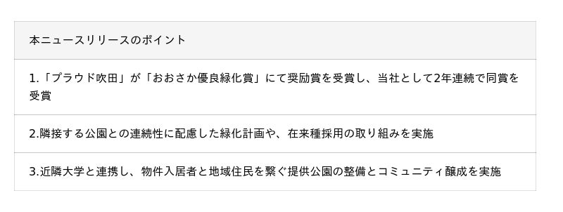 ※2: 2025年2月4日リリース:「おおさか優良緑化賞」・「みどりのまちづくり賞」にて大阪府知事賞をW受賞
