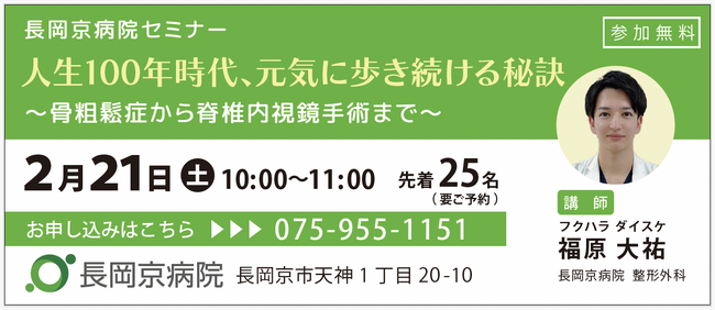 長岡京病院 2月21日(土)、骨粗鬆症に関するセミナーを開催!「人生100年時代、元気に歩き続ける秘訣」とは