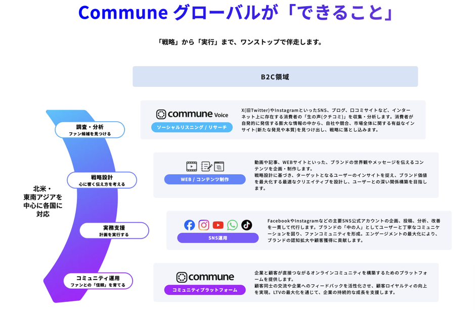 相互交流で信頼を育む「Commune」を提供するコミューン株式会社は、北米や東南アジアをはじめ海外展開に取り組む日系企業を一気通貫で支援する「Commune Global」の提供を開始したことをお知らせいたします。