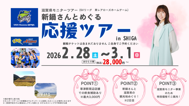 SAGA久光スプリングス所属アスリートの新鍋理沙と一緒に、SVリーグの応援と滋賀観光を楽しむ1泊2日のモニターツアーをご案内になります。