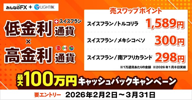 トレイダーズホールディングス株式会社(東京証券取引所スタンダード市場8704)のグループ会社で、外国為替証拠金取引事業(FX取引)等を営むトレイダーズ証券株式会社(本社:東京都渋谷区、代表取締役:須山 剛、以下「トレイダーズ証券」)は、2026年2月2日(月)より外国為替取引サービス「みんなのFX」および「LIGHT FX」において、「スイスフラン×高金利通貨 最大100万円キャッシュバックキャンペーン」を実施いたします。