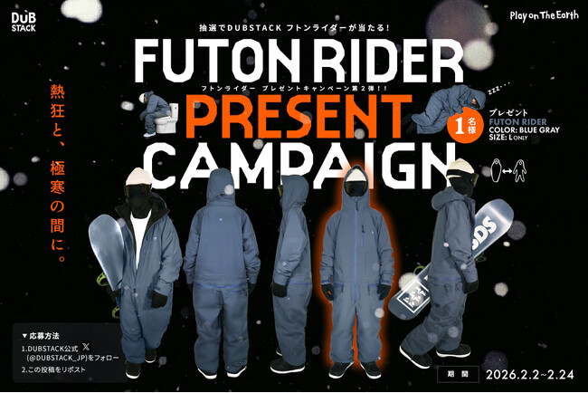ビーズ株式会社(所在地:大阪府東大阪市、代表:大上 響)が展開するストリートスポーツブランド「DUBSTACK(R)(ダブスタック)」は、2026年2月、世界的にウィンタースポーツ熱が急上昇するこのタイミングで、同ブランドの人気スノーウェア『フトンライダー』を抽選で1名様にプレゼントするSNSキャンペーンを実施いたします。