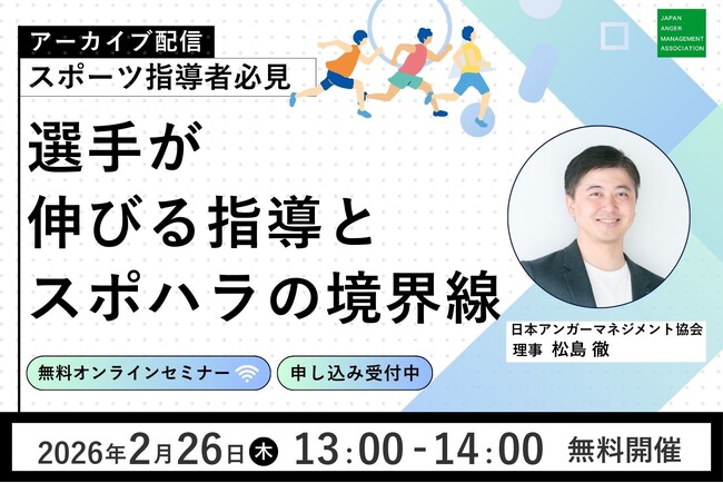 株式会社レビックグローバル(本社:東京都港区、代表取締役社長:柏木 理)が運営する一般社団法人日本アンガーマネジメント協会(所在地:東京都港区、代表理事:戸田久実)は、2025年4月に開催し好評を博したセミナー「スポーツ指導者必見!選手が伸びる指導とスポハラの境界線」のアーカイブ動画を2026年2月26日(木)13時より配信します。