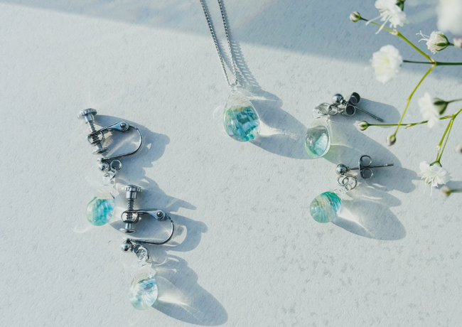 その貝殻に秘められた、エメラルドグリーンの深く柔らかな色彩と、大船渡の海の“なみ”を、ガラスのアクセサリーで表現しました。