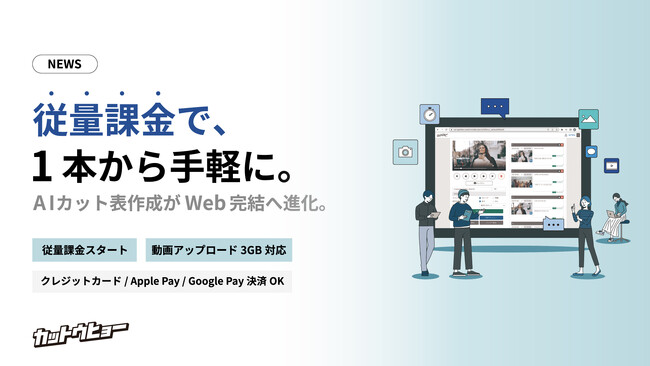ノースショア株式会社(本社:東京都港区、代表取締役:石井 龍)が運営する、カット表作成をAIで自動化するカットウヒョーは、2026年1月15日に大型アップデートを実施いたしました。 従来の法人向けプランに加え、クレジットカード等で即時利用可能な「従量課金(都度払い)プラン」を導入し、動画アップロード容量を「3GB」へ拡張しました。 本アップデートの公開直後より、国内大手広告代理店グループやTVCM制作大手のプロダクション等で導入が進むなど、制作現場の「働き方改革」を推進するツールとして注目を集めています。