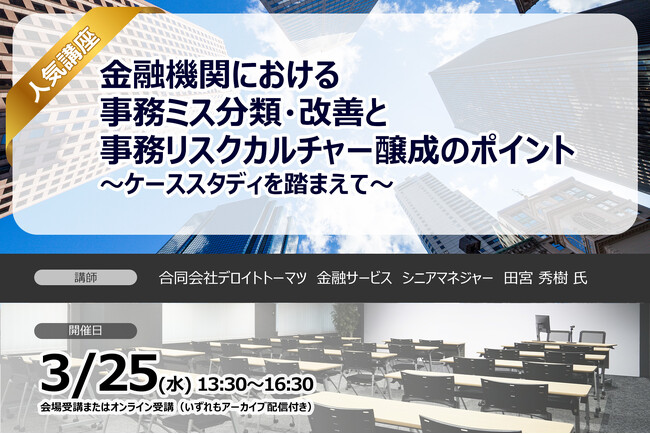 株式会社セミナーインフォ(本社:東京都千代田区、代表:小西 亘)は、2026年3月25日(水)13:30~16:30 に、金融機関における事務ミスの分類・改善と事務リスクカルチャーの醸成をテーマとしたセミナー「<人気講座>金融機関における事務ミス分類・改善と事務リスクカルチャー醸成のポイント」を、会場およびオンラインにて開催いたします。