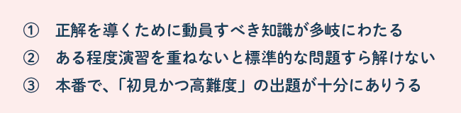 標準問題を解くまでのハードルが高いこの2分野も、いくつかのポイントをおさえ、基礎の壁を乗り越えさえすれば、決して、「まったく歯が立たない」という分野ではありません。ぜひ本冊子で早めの対策に着手し、ライバルに一歩差をつけましょう。