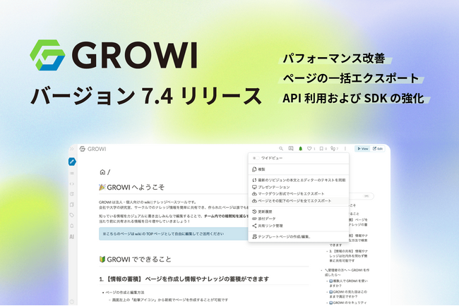 株式会社 GROWI(本社:東京都新宿区 代表取締役:武井 雄紀)は、オープンソース社内 wiki ツール「GROWI」のバージョン 7.4 を2025年12月24日にリリースしました。クラウド版サービス「GROWI.cloud」では stable 版としてバージョン 7.4.3 の提供を開始しています。