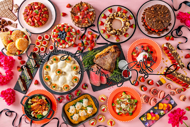 ブランドいちご食べ比べ~毎日2種食べ放題~(あまおう、紅ほっぺ、とちあいか、とちおとめ、きらぴ香など)、揚げたて生ドーナツ、北海道ミルクのショコラフレンチトースト、チョコ&ピンク2色のファウンテン(平日はいずれか1種)、リンゴのモスコビット ノルマンディー風【ディナービュッフェ限定】、ストロベリーアイス、バニラアイス、クリームチーズアイス