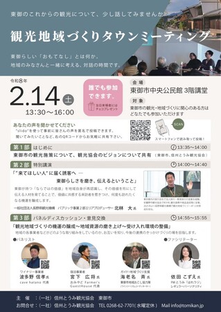 長野県東御市および(一社)信州とうみ観光協会は、令和7年度の「観光地域づくりタウンミーティング」を2026年2月14日(土)に開催いたします。
