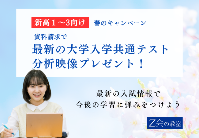 高校生活のスタートを切る方も、受験に向けたギアを上げる方も、大学入学共通テストの最新動向を知っておくことは不可欠です! Z会の教室では、精鋭講師陣が最新の共通テストを徹底分析。その要点と攻略のヒントを凝縮した解説動画をZ会の教室・高校生向け資料をご請求された方限定で公開しています。