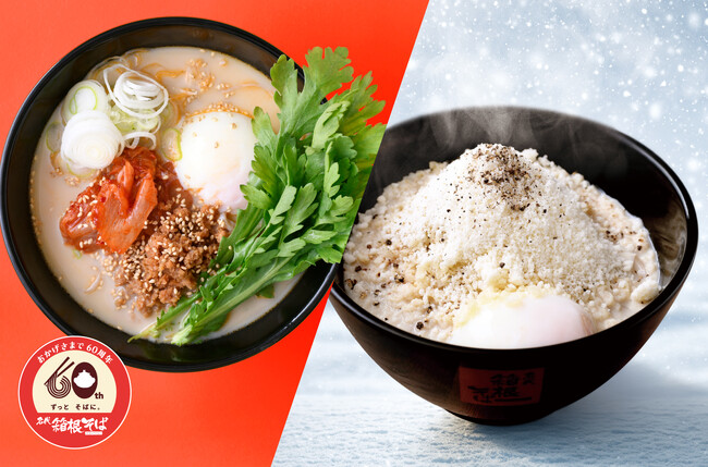 60周年記念キャンペーン第14弾として2026年2月10日(火)から2月28日(土)まで「豆乳チーズ雪そば」を、第15弾として3月1日(日)から3月31日(火)まで「ソイキムタンそば」を、箱根そばの一部店舗にて販売いたします。ぜひご賞味ください。