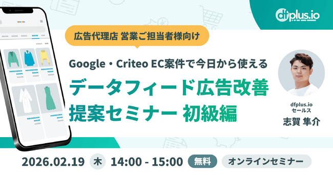 株式会社フィードフォース(所在地:東京都港区、代表取締役:塚田 耕司、以下「フィードフォース」)が提供する、マーケターのためのデータフィード管理ツール「dfplus io」は、無料オンラインセミナー「Google・Criteo EC 案件で今日から使えるデータフィード広告改善 提案セミナー 初級編」を 2026 年 2 月 19 日(木)に開催いたします。