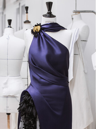 EJAEは、ブラックのレースとチュールをあしらったインディゴサテンドレスを着用しました。ドレスには花房の刺繍と、ディオールの「メダリオン」ブローチがあしらわれています。