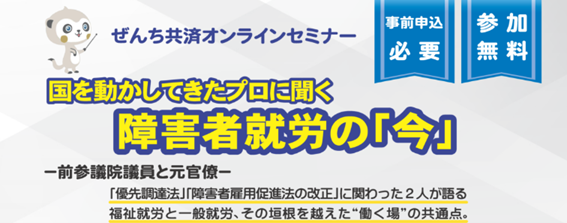 障害者向けの保険を取り扱う専門保険会社、ぜんち共済株式会社(本社:東京都千代田区、代表取締役社長:榎本重秋)は、2026年2月14日(土)に、前参議院議員と元官僚という、政策・行政の最前線を歩んできた二人の専門家から、最新の福祉動向を学べるオンラインセミナーを開催いたします。