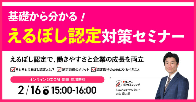 Pマーク、 ISOコンサルにおける支援実績 No.1(注1)のISO/Pマークの取得・運用支援サービス「認証パートナー」を提供する株式会社スリーエーコンサルティング(本社:大阪府大阪市、代表取締役社長:竹嶋 寛人)は、2月16日(月)15:00-16:00「基礎からわかる!えるぼし認定対策セミナー」を開催します。「えるぼし認定ってなに?」「認定取得の流れ、やるべきことが分からない…」という方へ向け、取得のメリットや取得の流れ、ポイントと注意事項などをえるぼし認定のプロが分かりやすく解説いたします。