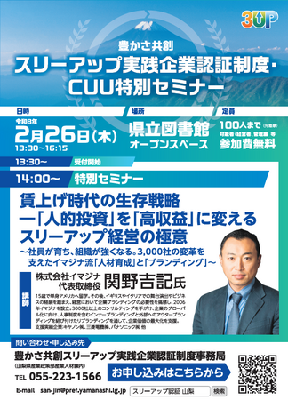 株式会社イマジナ(本社:東京都千代田区、代表取締役:関野吉記、以下「イマジナ」)は、山梨県と連携し、2026年2月26日(木)に山梨県立図書館にて、特別セミナー「賃上げ時代の生存戦略 ―『人的投資』を『高収益』に変えるスリーアップ経営の極意」を開催いたします。