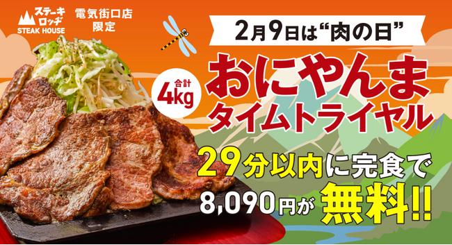 「“楽しい”でつながる世界をつくる」を理念とする飲食企業である株式会社ファイブグループの関連企業である株式会社B級グルメ研究所(本社:東京都武蔵野市、代表取締役社長:坂本 憲史)が運営するステーキハウス『肉と炒め野菜 ステーキロッヂ』では、2026年2月9日(月)の肉の日にちなみ、総重量4kgの「おにやんま」のタイムトライアルを実施いたします。食べ始めから29分以内に完食された方はお食事代金8,090円が無料に! ぜひお腹の底から肉の日をお楽しみください。