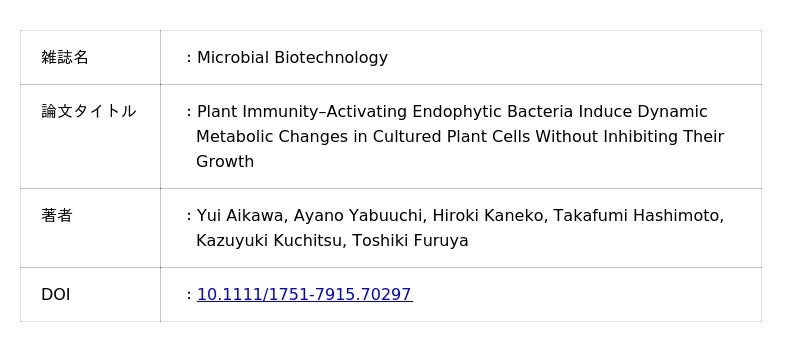 本研究成果は、植物培養細胞の代謝プロファイルを改変して有用化合物を生産する手法として、内生細菌の活用が有望であることを示しています。本手法は、医薬品や機能性素材の開発へ展開できる基盤技術として、今後の応用が期待されます。