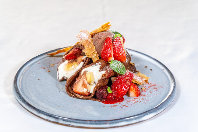 もっちりと焼き上げたクレープ生地に、甘酸っぱい苺とやさしい甘さのバナナをたっぷり包み込み、チョコレートソースで仕上げました。