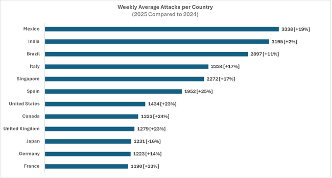 サイバー攻撃の手法と構造の変化におけるサイバーセキュリティ業界の主要な傾向を明らかに 日本は2024年比16%減となる週平均1231件の攻撃を受け上位12カ国中10位